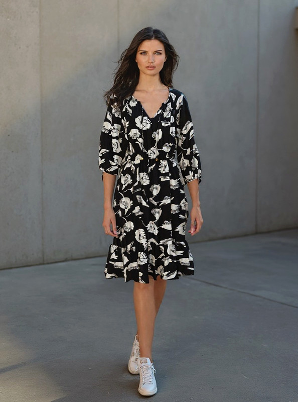Stylish Floral Print Midi Dress with Drawstring and Two Side Pockets (S/M/L) quantity