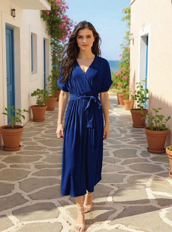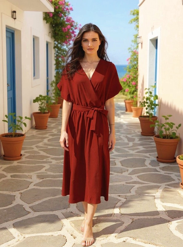 Comfy V Neck Midi Dress with Two Side Pockets (S/M/L)