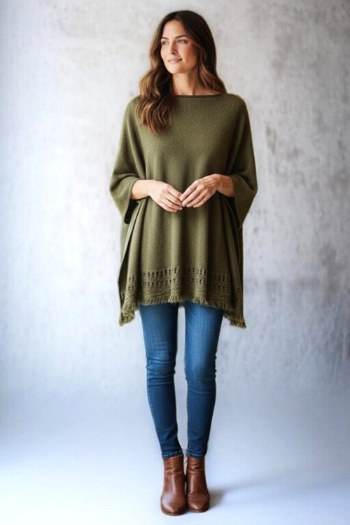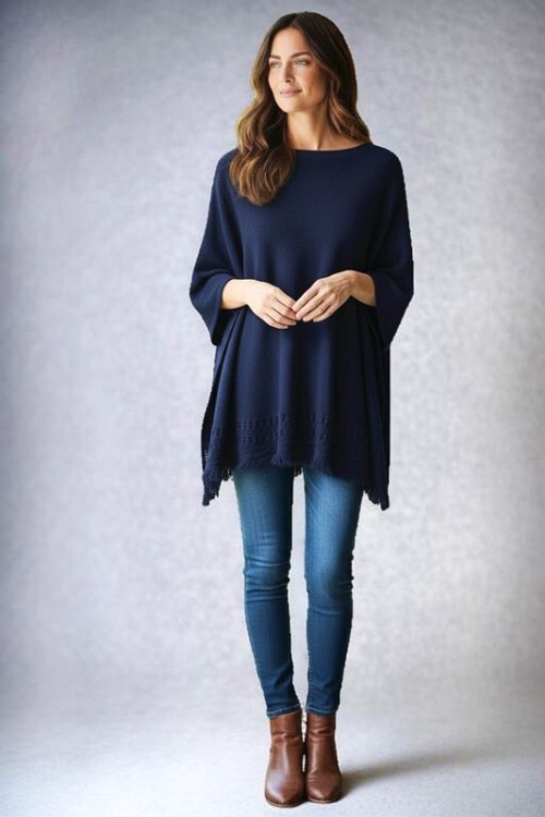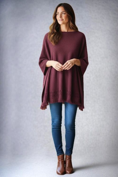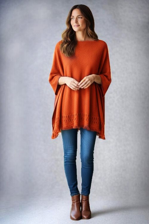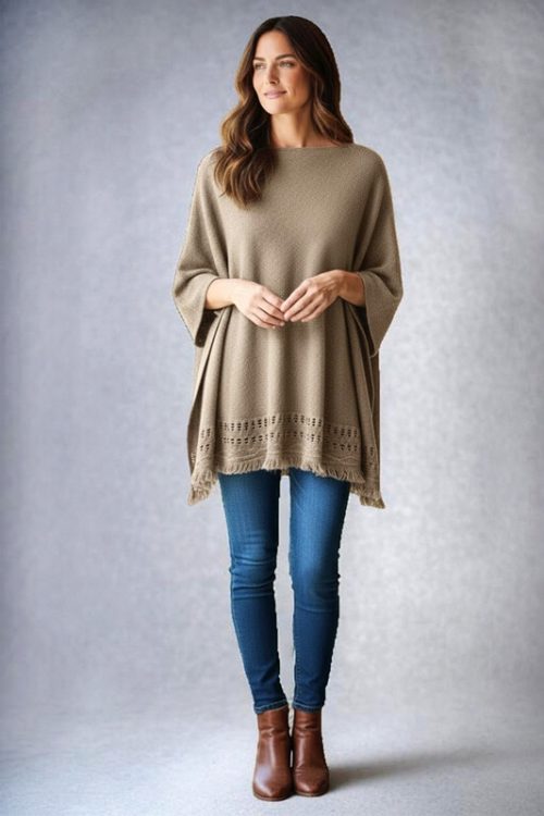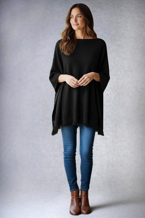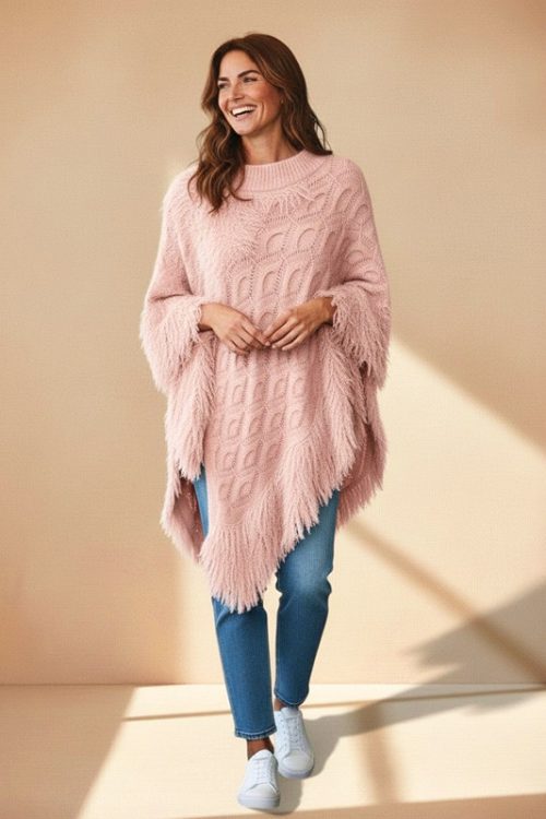 Knitted Pullover Poncho with Fringe