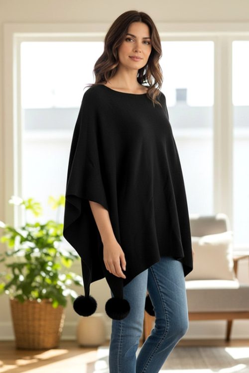 Stylish Pullover Poncho with Pompoms
