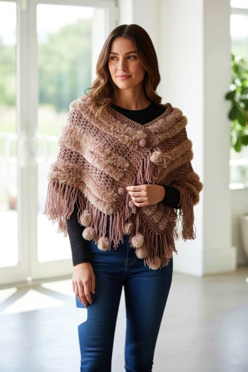 Cute Knitted Shawl with Rabbit Fur Pompoms