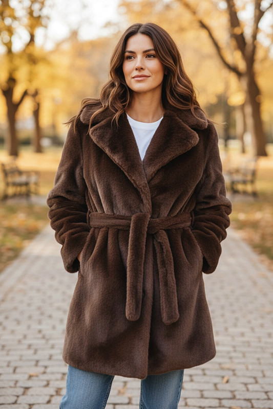 Mid Length Faux Mink Fur Coat with Belt and Two Side Pockets – S/M & L/XL