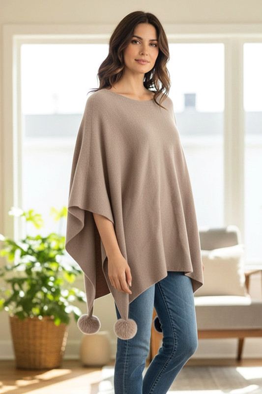 Stylish Pullover Poncho with Pompoms
